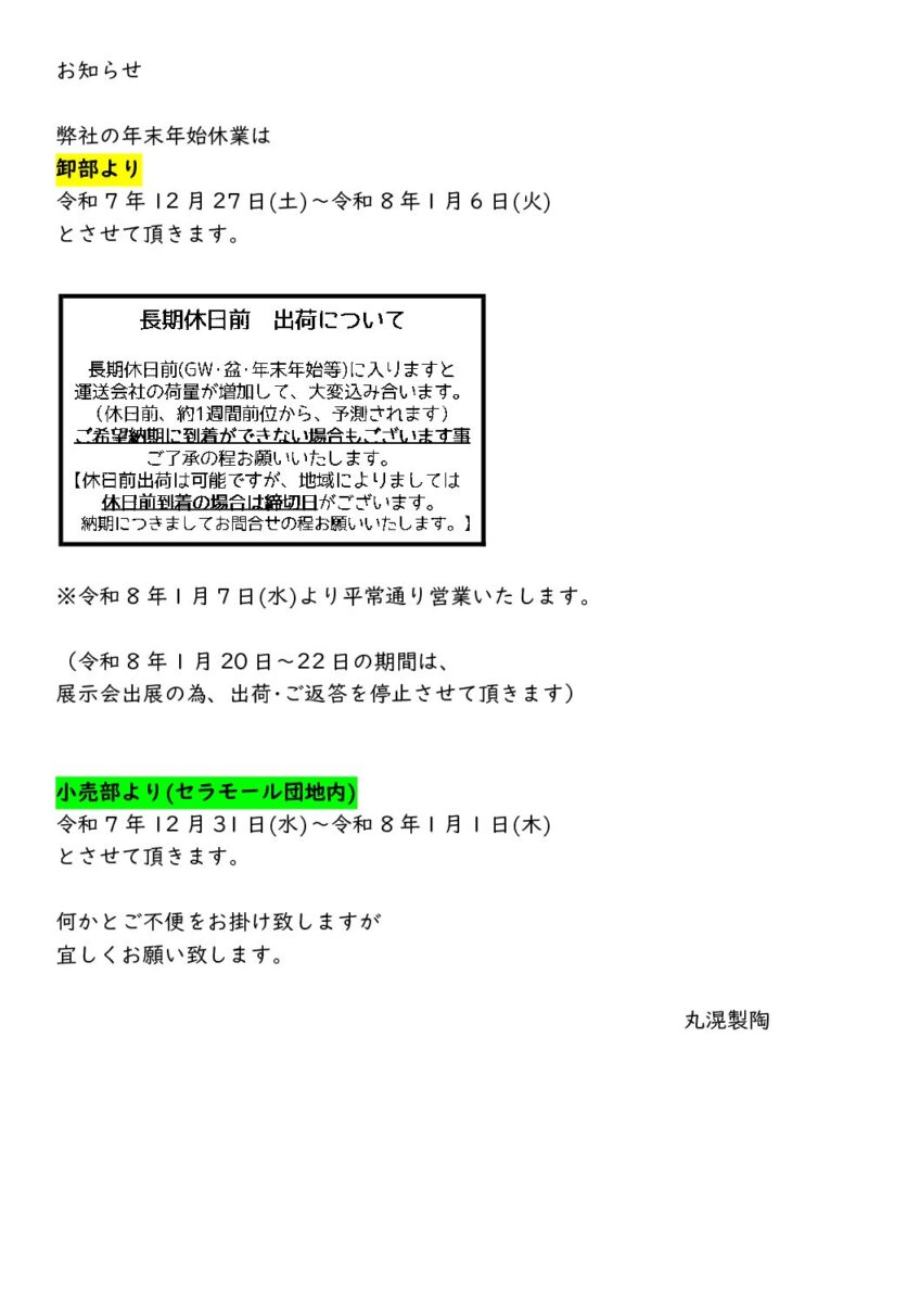 平素より丸滉製陶をご愛顧いただき、誠にありがとうございます。